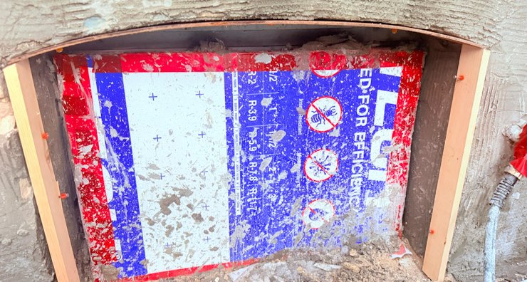 When there is nothing to nail to, wood strips to form window returns are wedged with