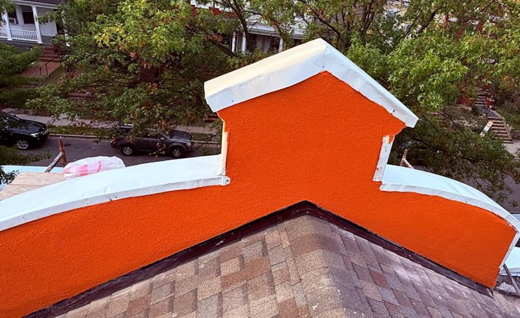 Note the metal flashing at the base of the parapet. We put a finish on the back of the parapet