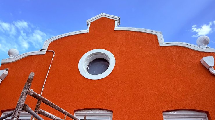 The band on the parapet, the ring around the window and other details were finished with white portland cement and white sand.